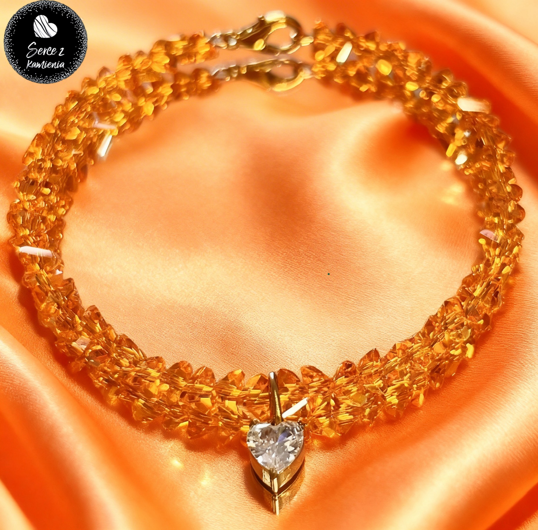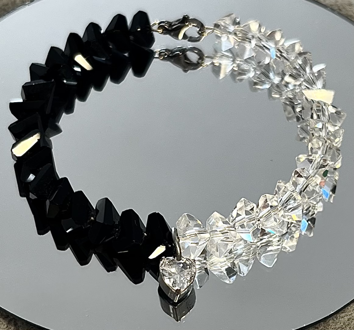 Bransoletka z czarnego i kryształowego szkła jubilerskiego z zawieszką – serduszko cyrkonia