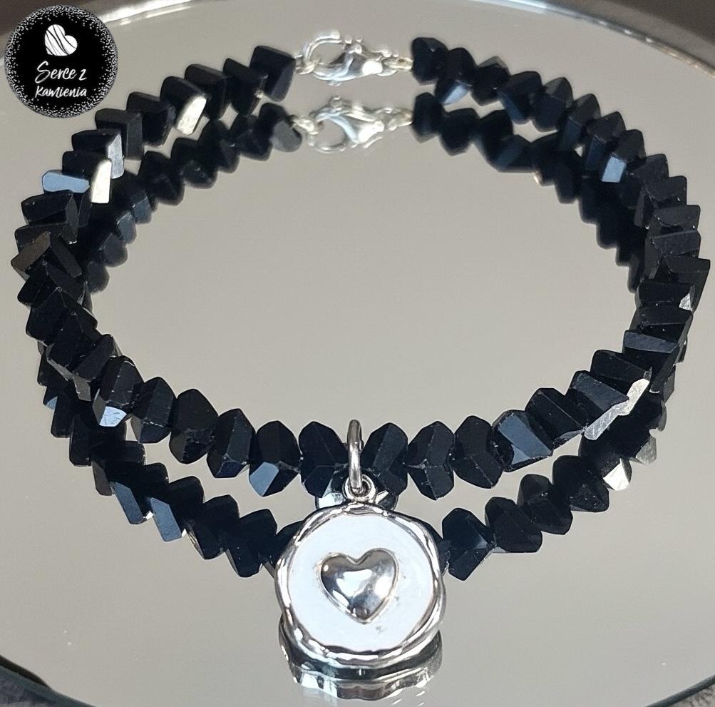Bransoletka z czarnego szkła jubilerskiego z zawieszką – serce obwód