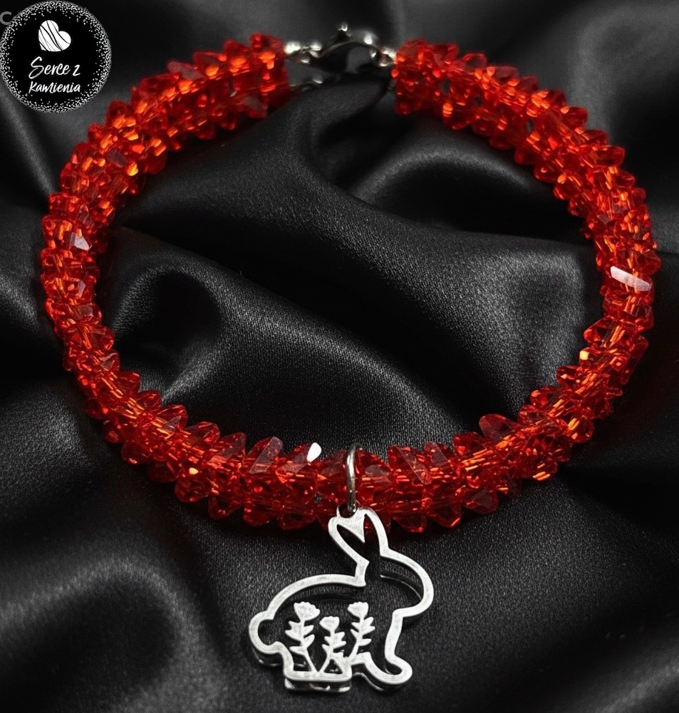 Bransoletka z czerwonego szkła jubilerskiego z zawieszką – króliczek