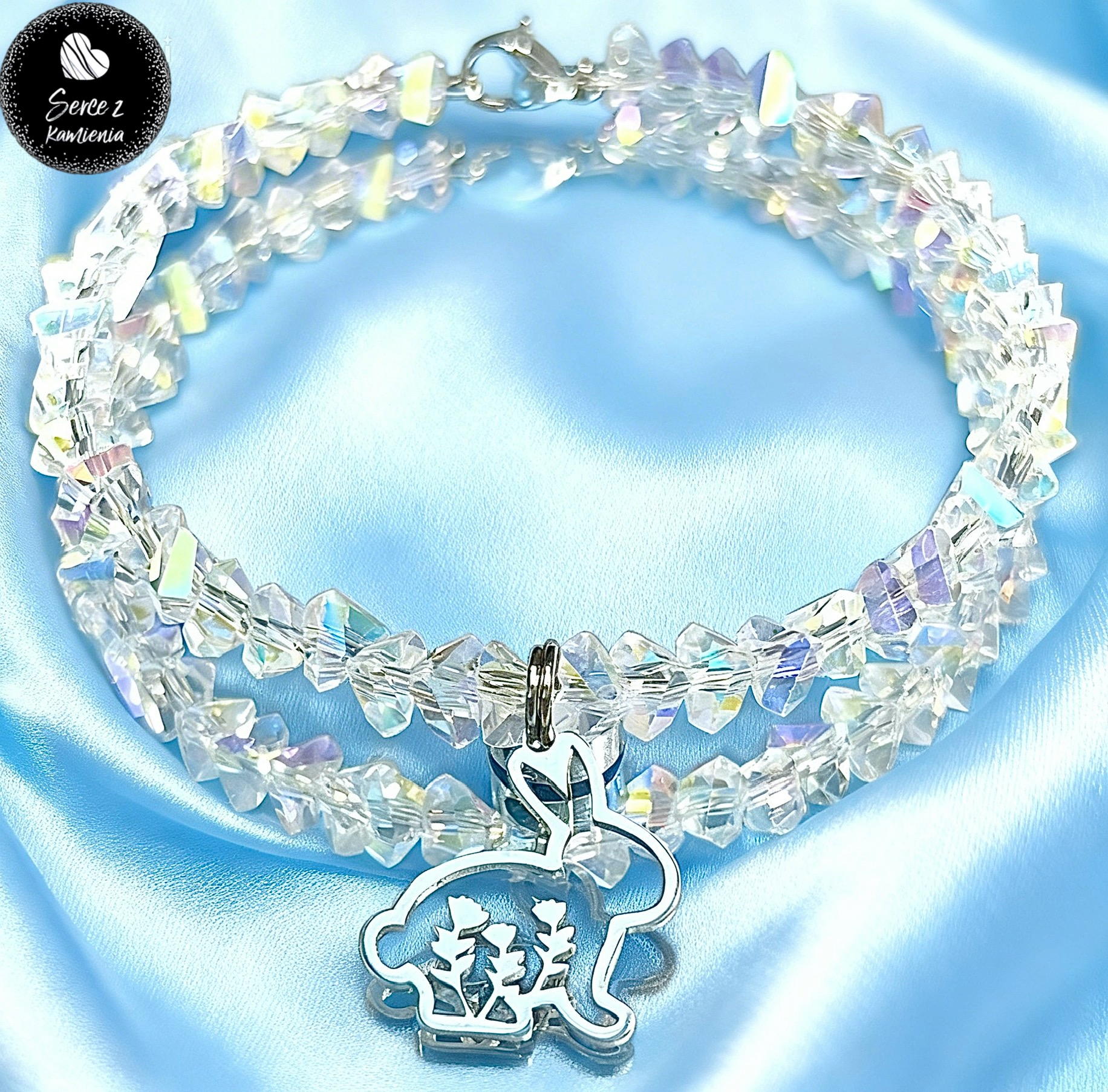 Bransoletka z kryształowego opalizującego szkła jubilerskiego z zawieszką – króliczek