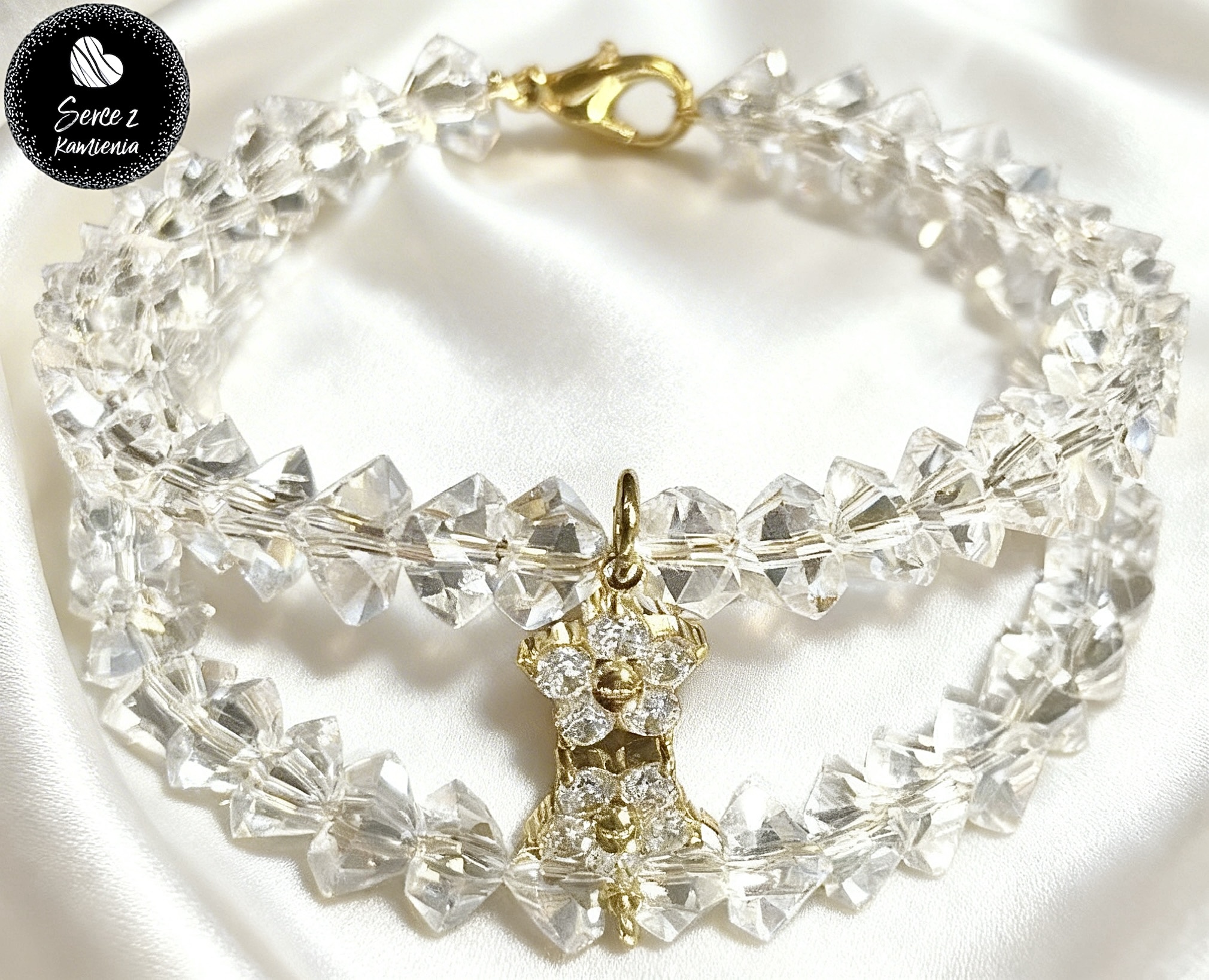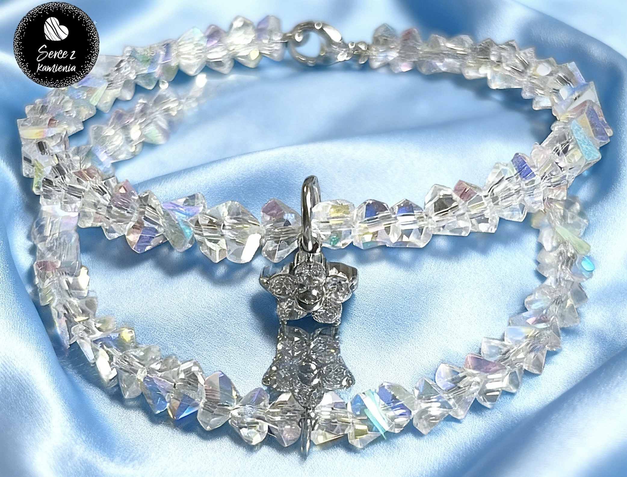 Bransoletka z kryształowego opalizującego szkła jubilerskiego z zawieszką – kwiatek cyrkonia