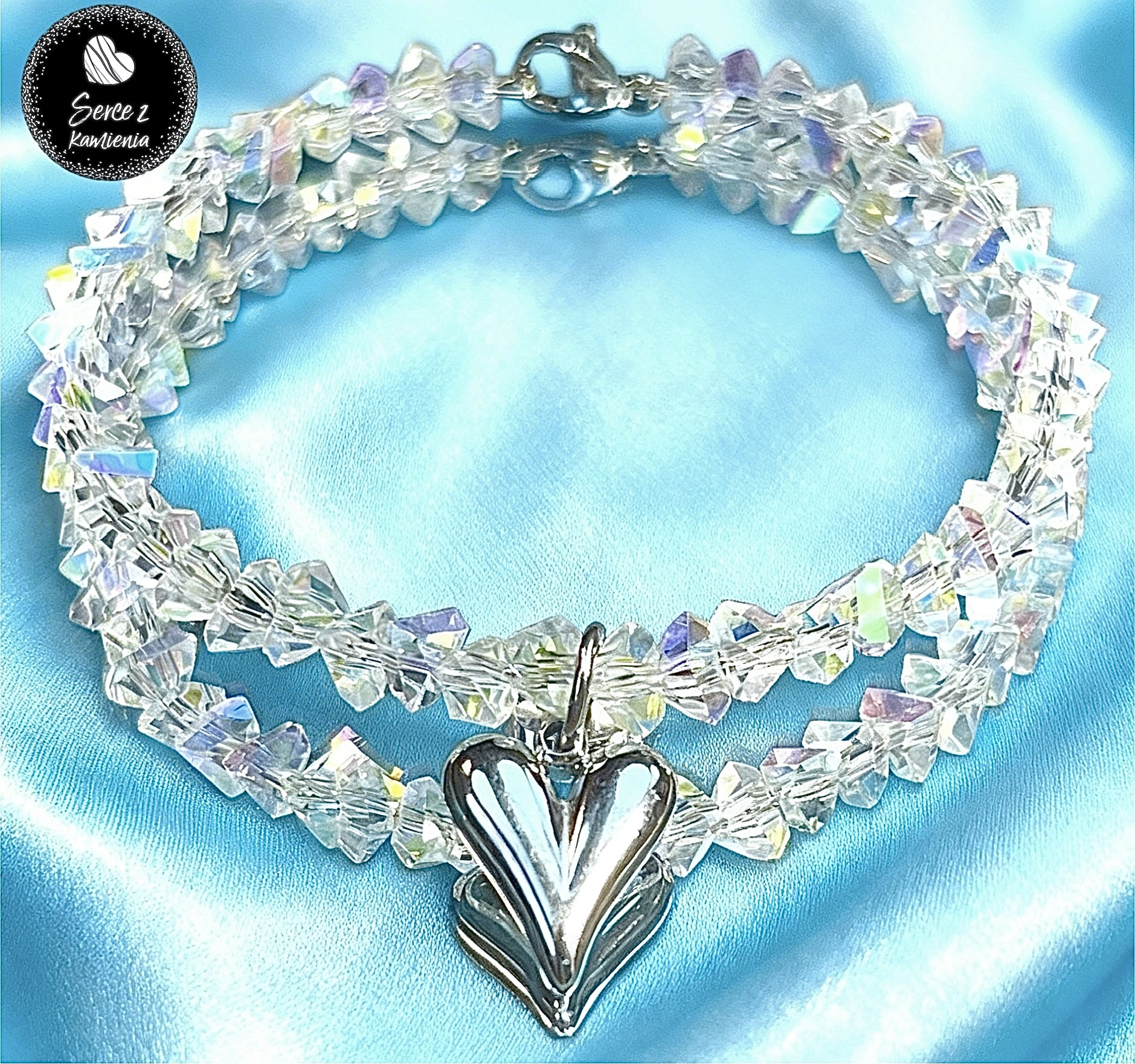 Bransoletka z kryształowego opalizującego szkła jubilerskiego z zawieszką – serce obwód