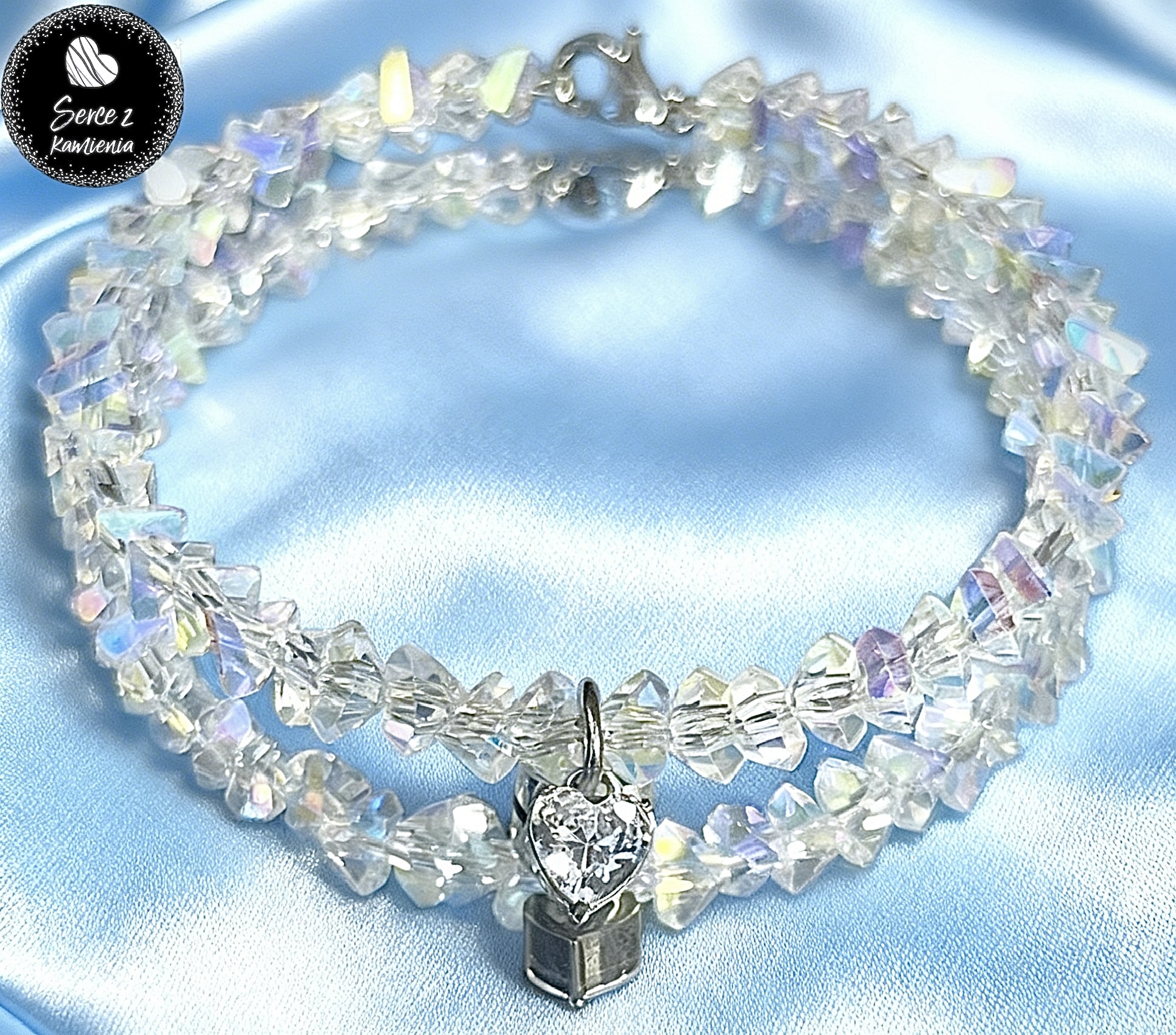 Bransoletka z kryształowego opalizującego szkła jubilerskiego z zawieszką – serce