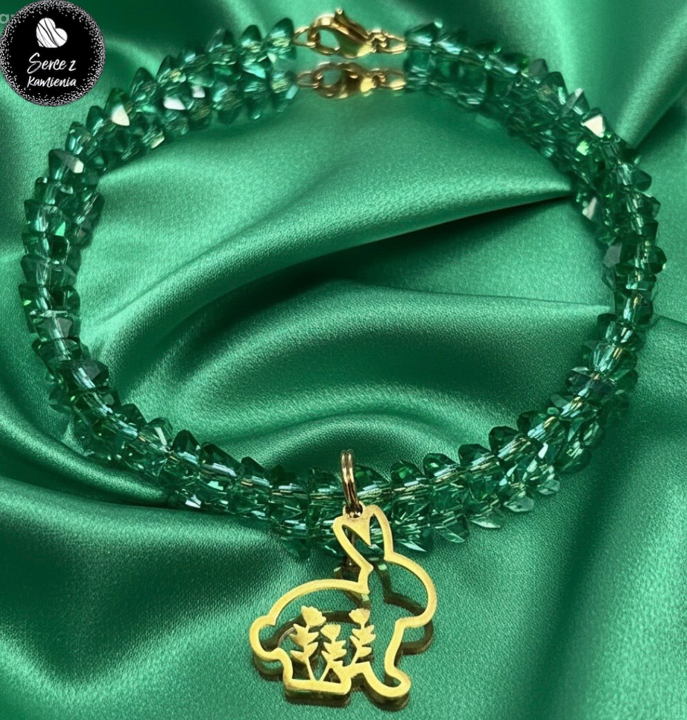 Bransoletka z zielonego szkła jubilerskiego z zawieszką – króliczek